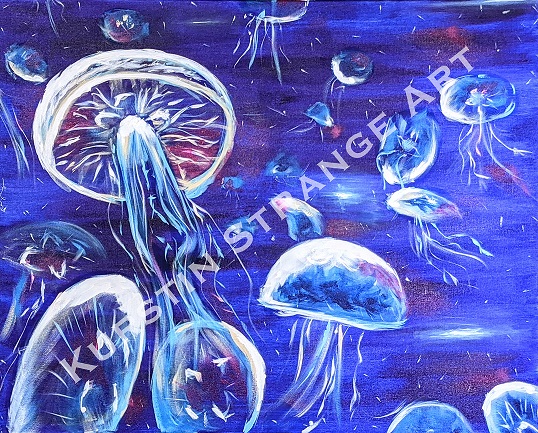 20" x 30" acrylic painting on canvas, jellyfish floating in the sea. Vibrant, ethereal, and a little bit alien, this eye-catching piece will be sure to start conversation wherever it's placed.